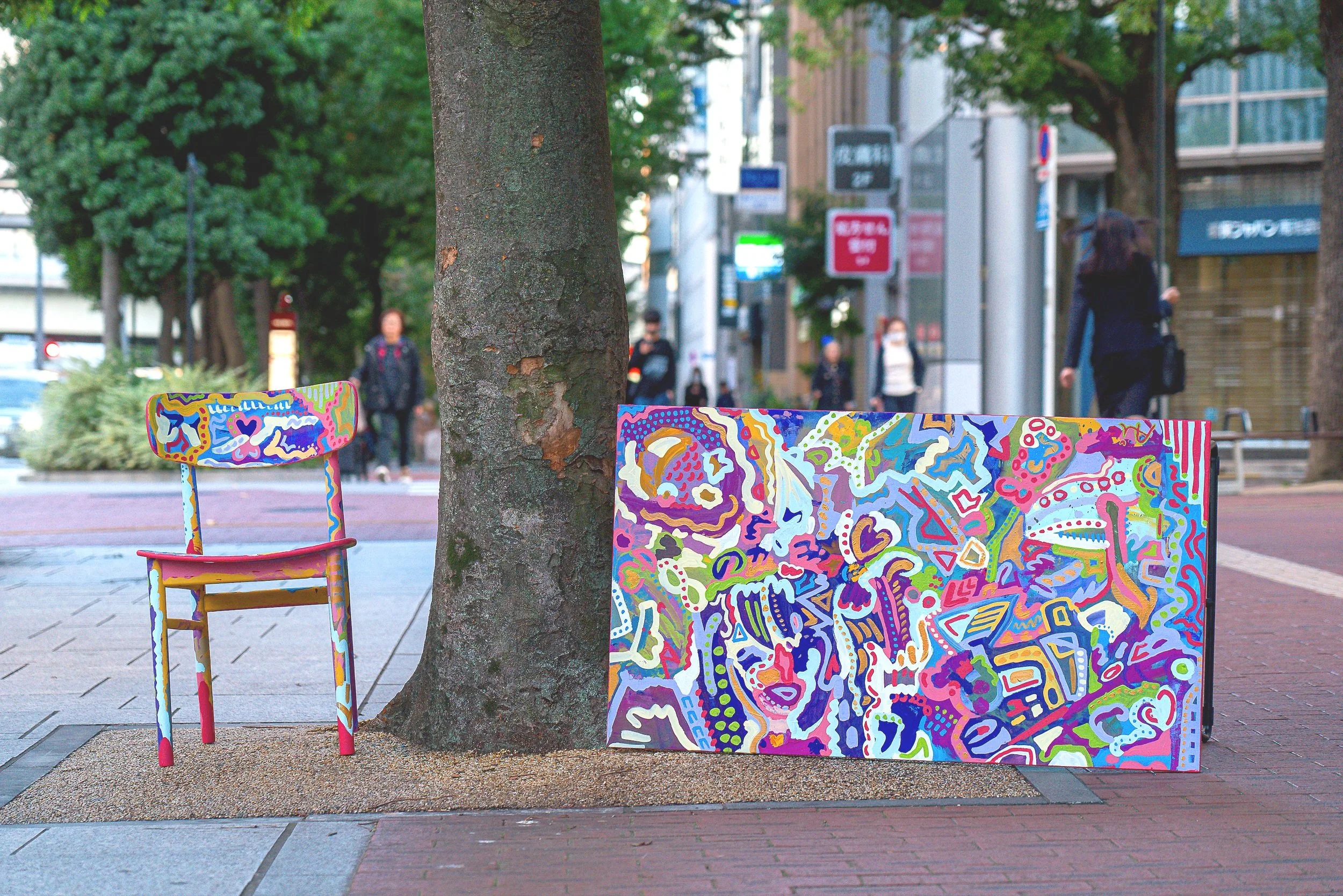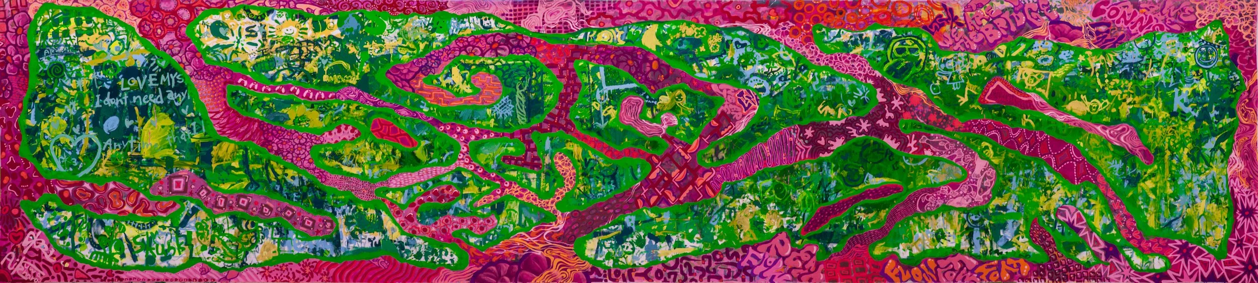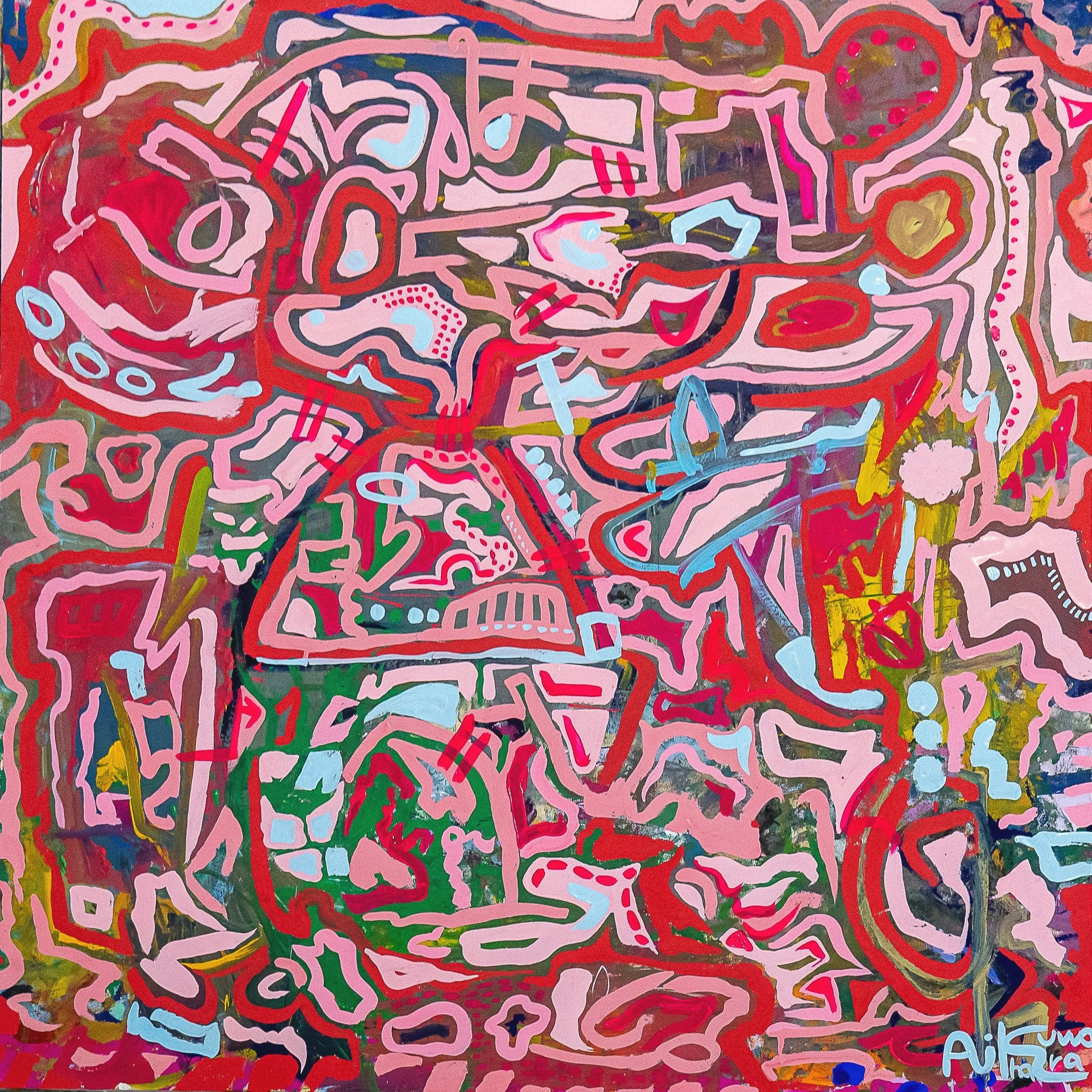 模様の中にさまざまなモチーフを隠し、鑑賞者がいろいろな形を 「見つける」という行為を楽しんでもらえる絵を制作し、エネルギッシュで愛いっぱいのアートを目指している。