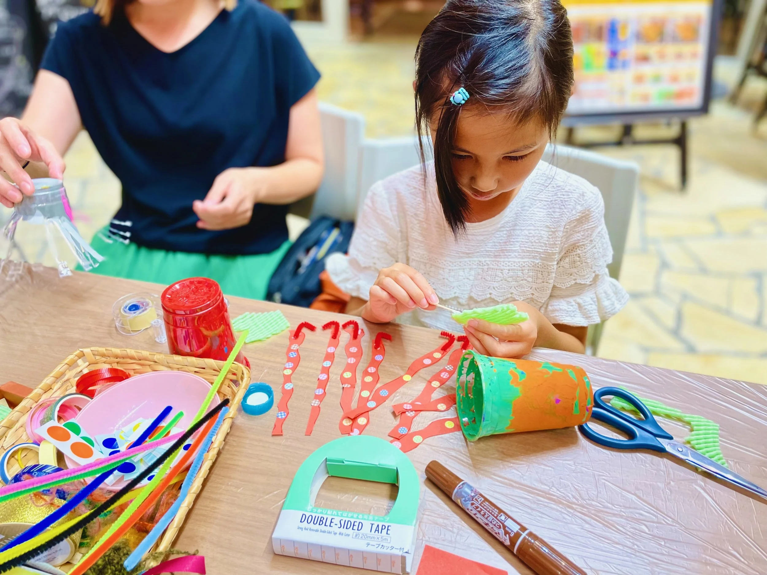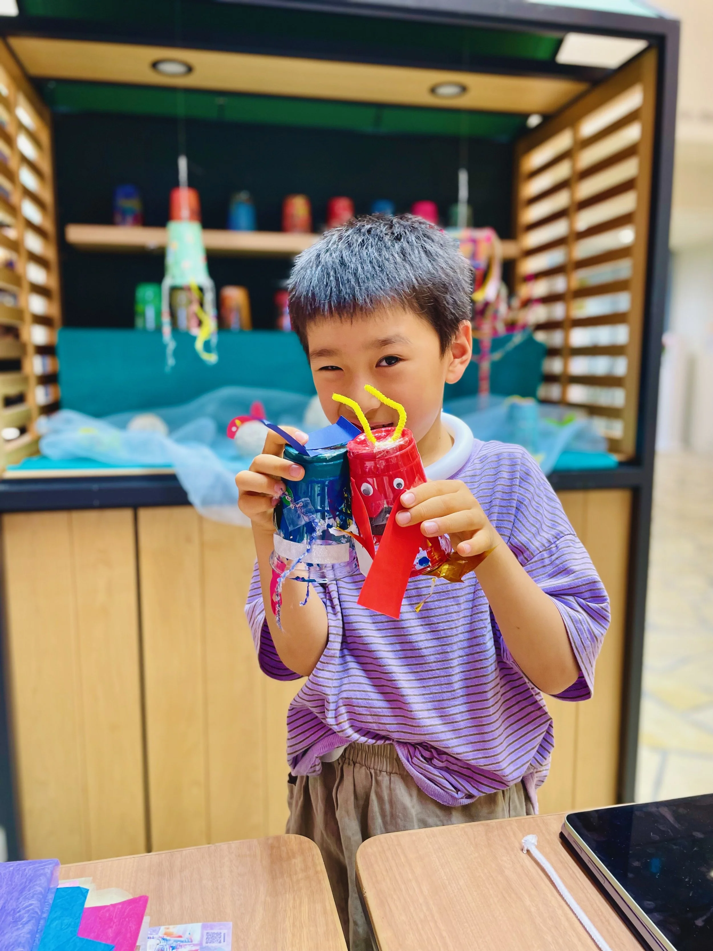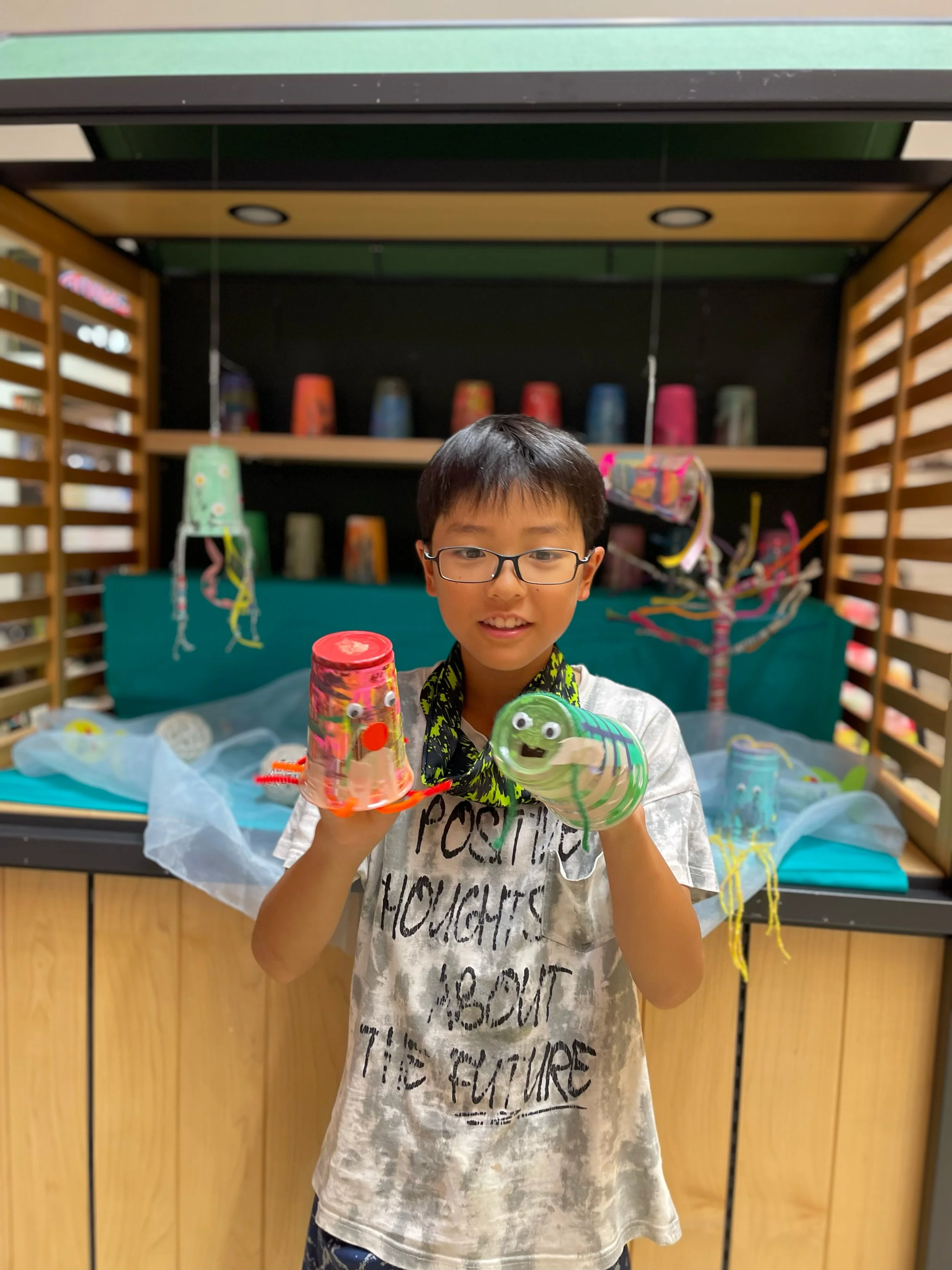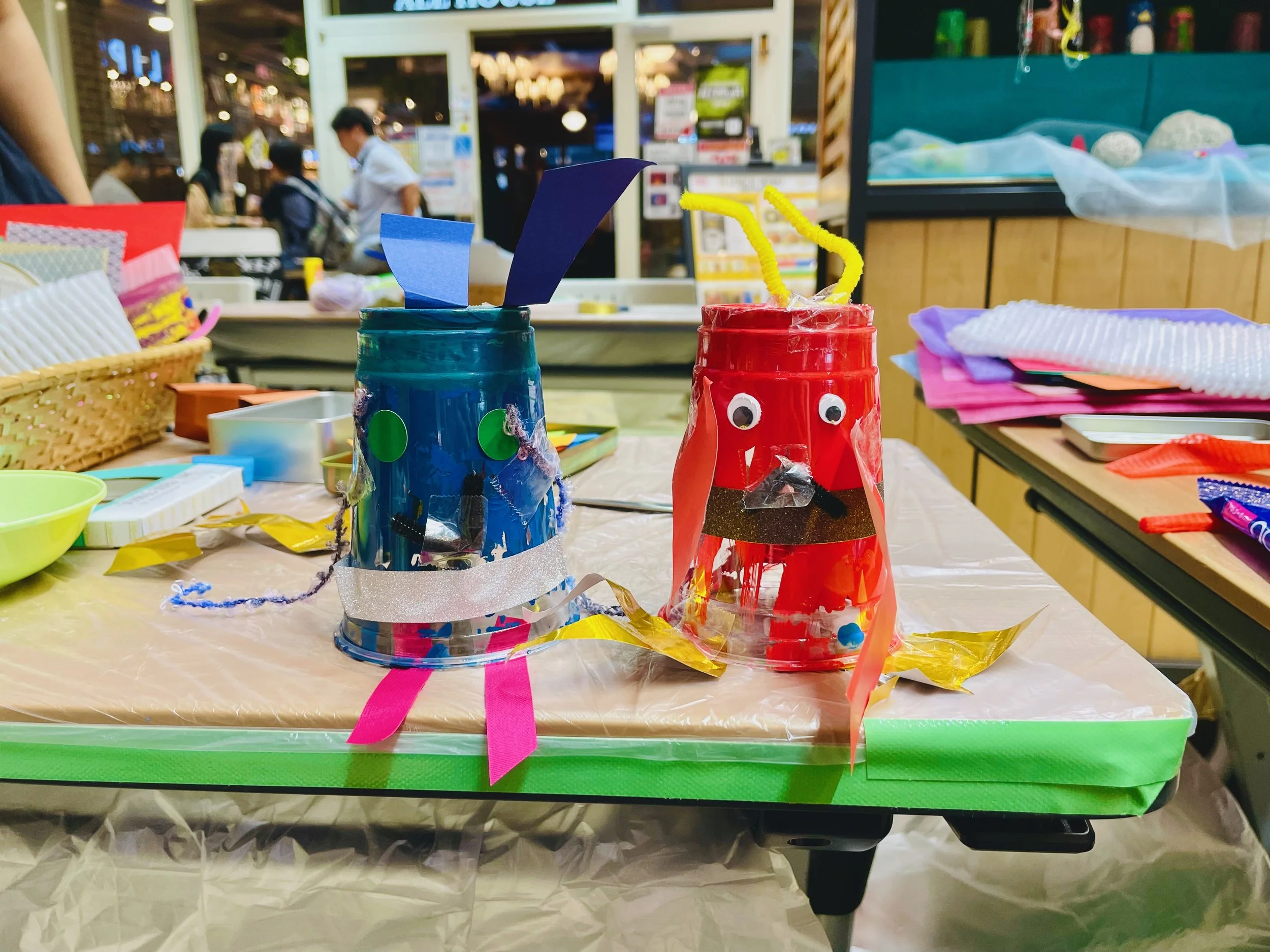 そのワークショップで使用した絵の具まみれのプラスチックカップをデコレーションして、海の生き物を作りました。