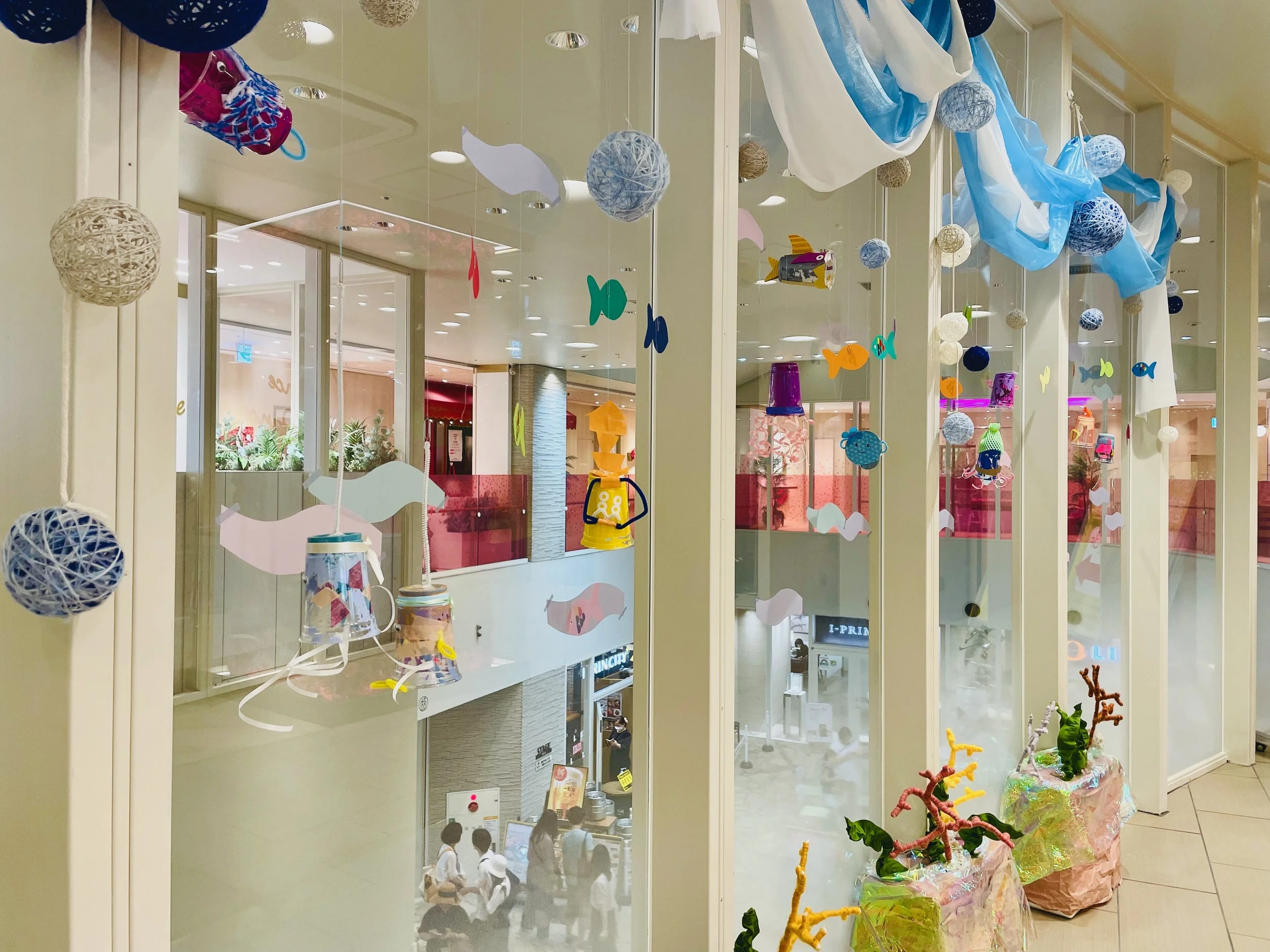 みんなで作ったプラカップ作品が、WACCAの2Fアートスペースに展示され、参加者全員で大きな海のアートを完成させました。